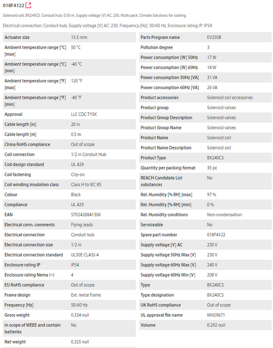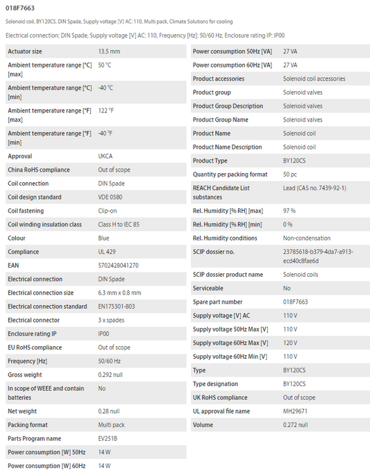 Danfoss 018F7663 Solenoid Coils, Type BY120CS, IP00, DIN Spades, 120V AC, 14W, BY120CS Series