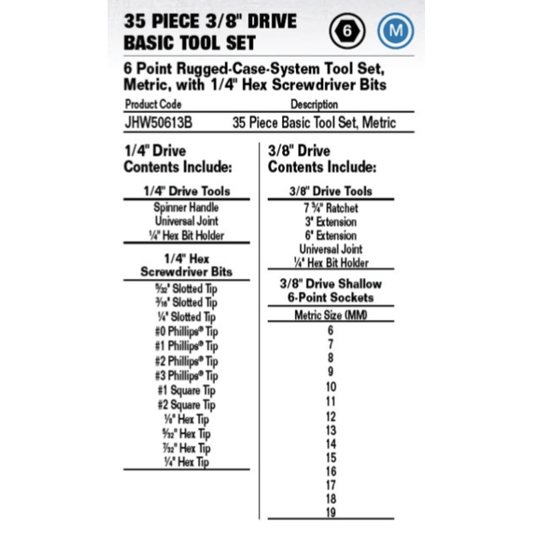 JHW50613B - Williams - Basic Tool Set with 1/4" Hex Screwdriver Bits 6 Drive 6-Point Metric 35pc