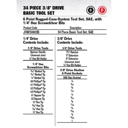 JHW50603B - Williams - 3/8 Drive 34pc Basic Tool Set