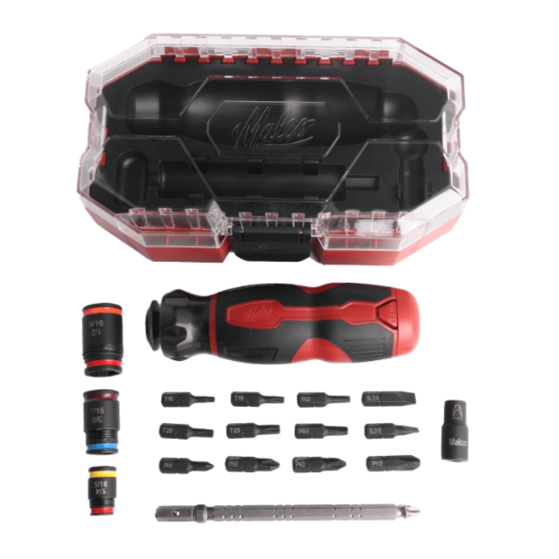 The kit also features Malco’s Impact Rated C‑RHEX® 7‑in‑1 #2 Phillips Flip Bit Socket Set, delivering superior versatility in one compact tool. Three color‑coded, cleanable, reversible C‑RHEX® sockets cover six hex sizes: